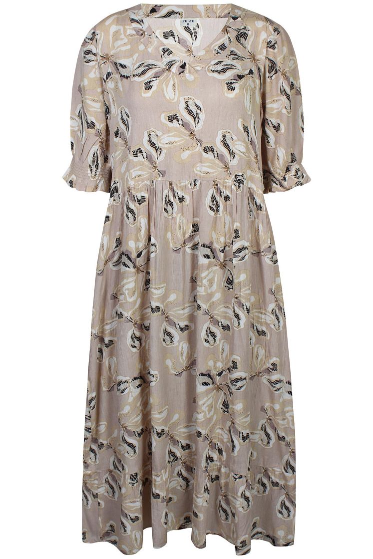 ZE-ZE maximekko mukavan ohutta ja pehmeää viskoosikreppiä. Mallissa on ilmava ja kauniisti levenevä helma sekä kiva v-pääntie. Lyhyeen hihaan antaa ryhtiä joustoresori. Malli on väljä.