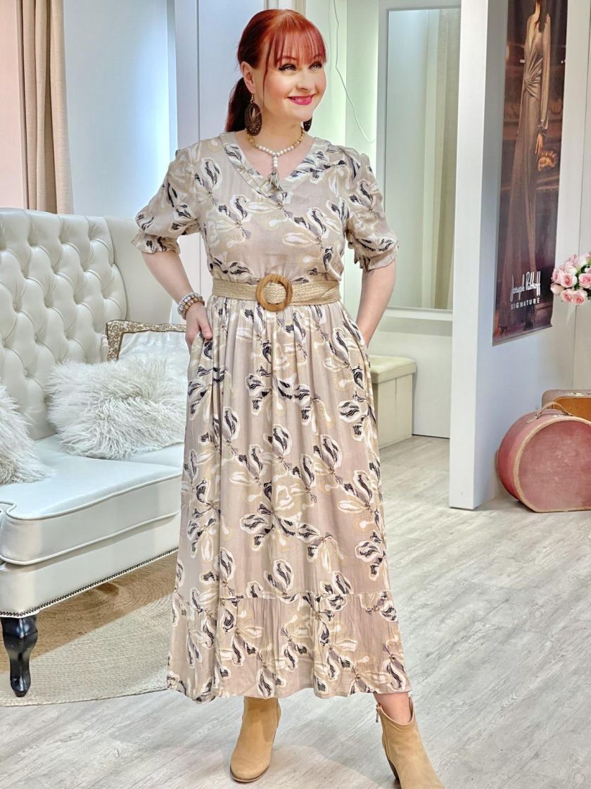 Miten kaunis kuosi kahdessa värissä ja huoleton kreppikangas! ZE-ZE maximekko mukavan ohutta ja pehmeää viskoosikreppiä. Mallissa on ilmava ja kauniisti levenevä helma sekä kiva v-pääntie. Lyhyeen hihaan antaa ryhtiä joustoresori. Malli on väljä.
