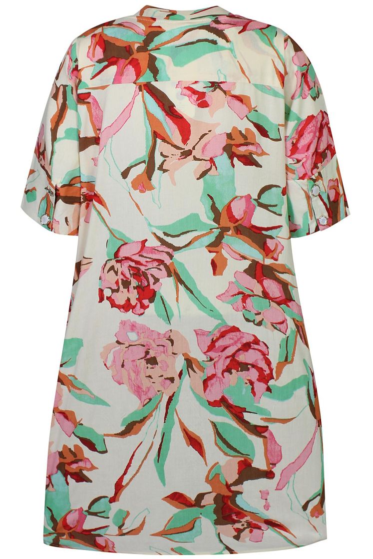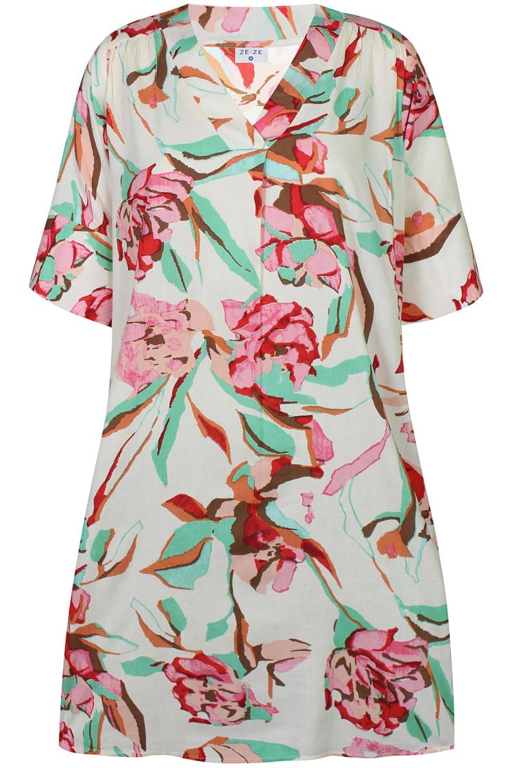 Ze-Ze mekko kivan värikäs kukallinen mekko/tunika. Materiaali ohutta miellyttävää viskoosia. Pääntie alla laskos, sivuilla rentoutta tuo taskut ja hihansuissa söpöt kirkkaat napit. Malli on suora, ja linjakkuutta saa vyöllä.