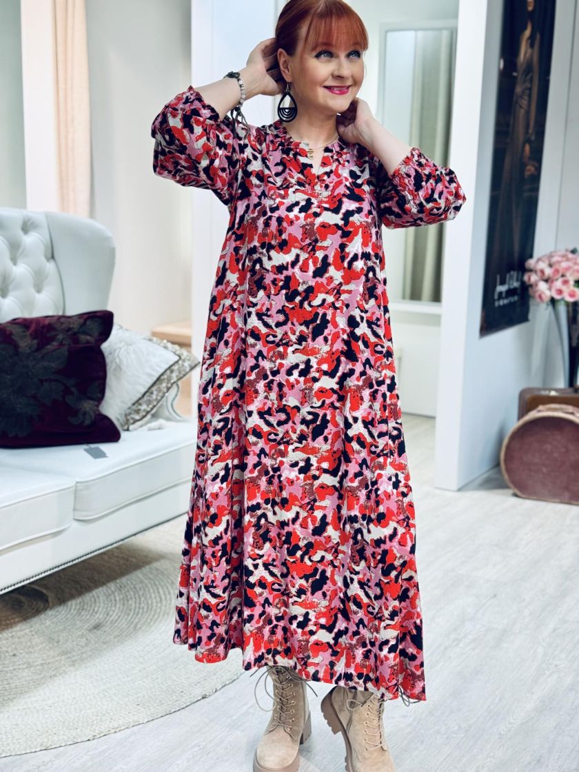Ze-Ze mekko mukavaa ohutta viskoosia. Mekossa kaunis kuvio. Malli ylhäältä istuva ja laskeutuu kauniisti a-linjaisesti helmaa kohden. Pääntiellä frilla ja vajaamittaisessa hihassa kuminauharesori. Sivuilla rentoutta tuo taskut.