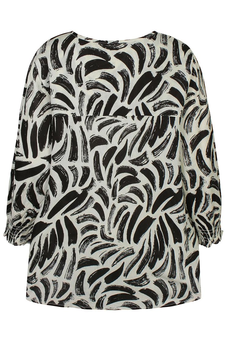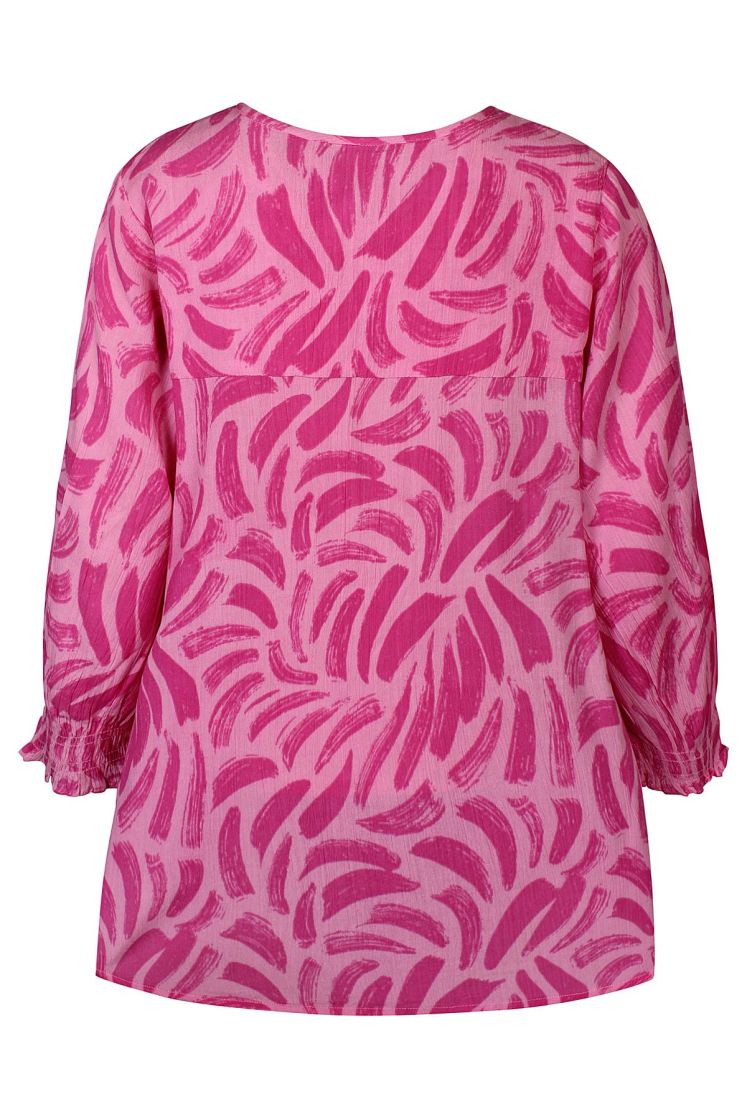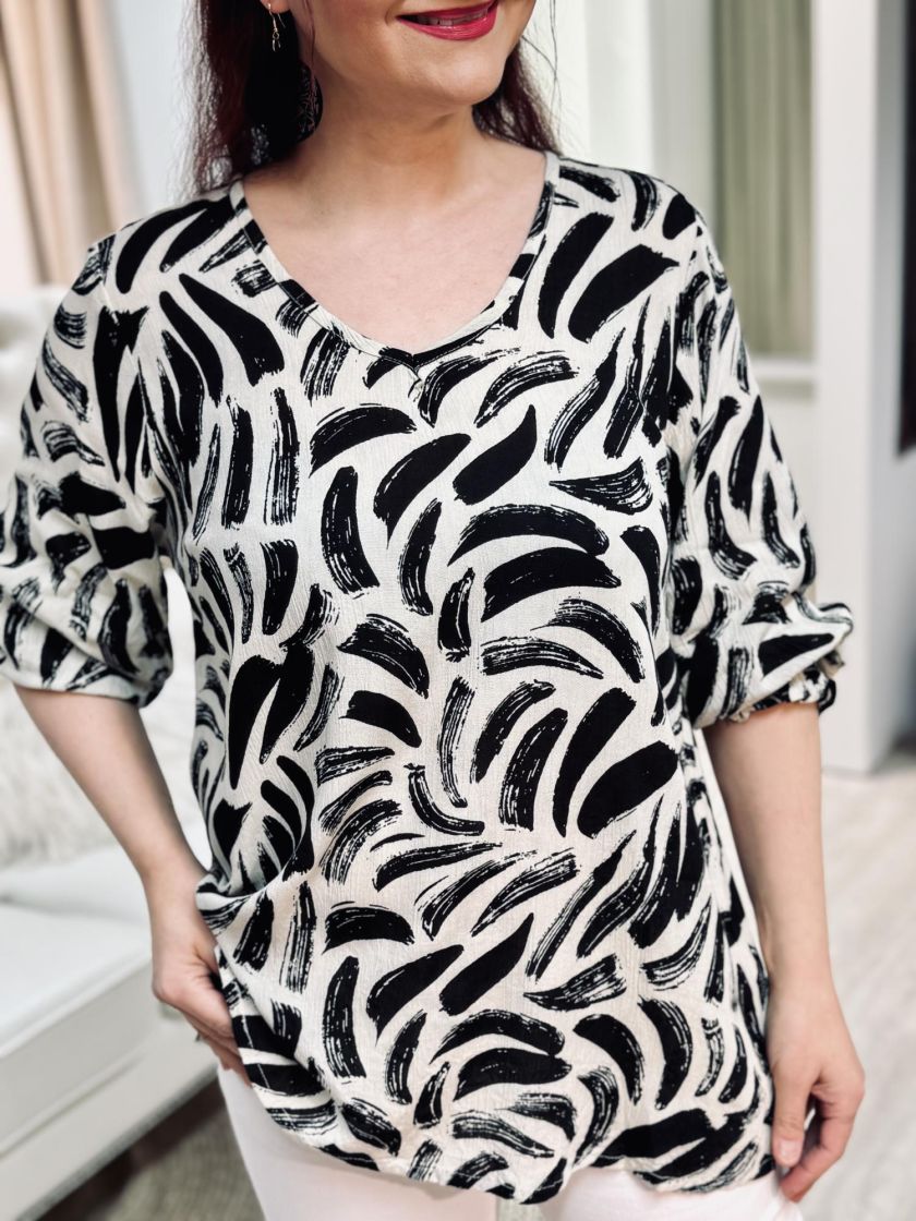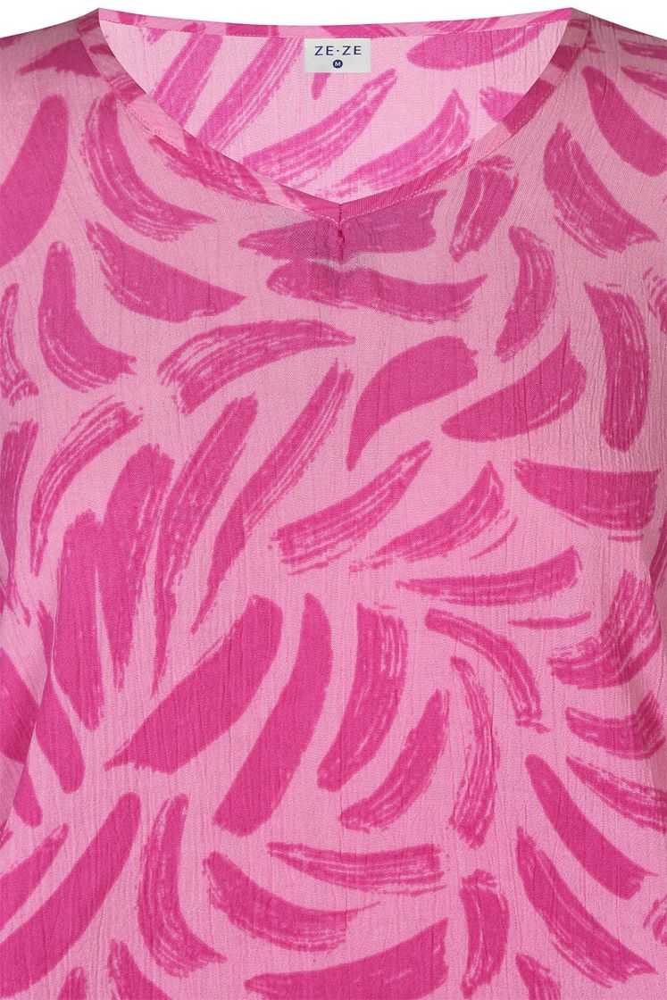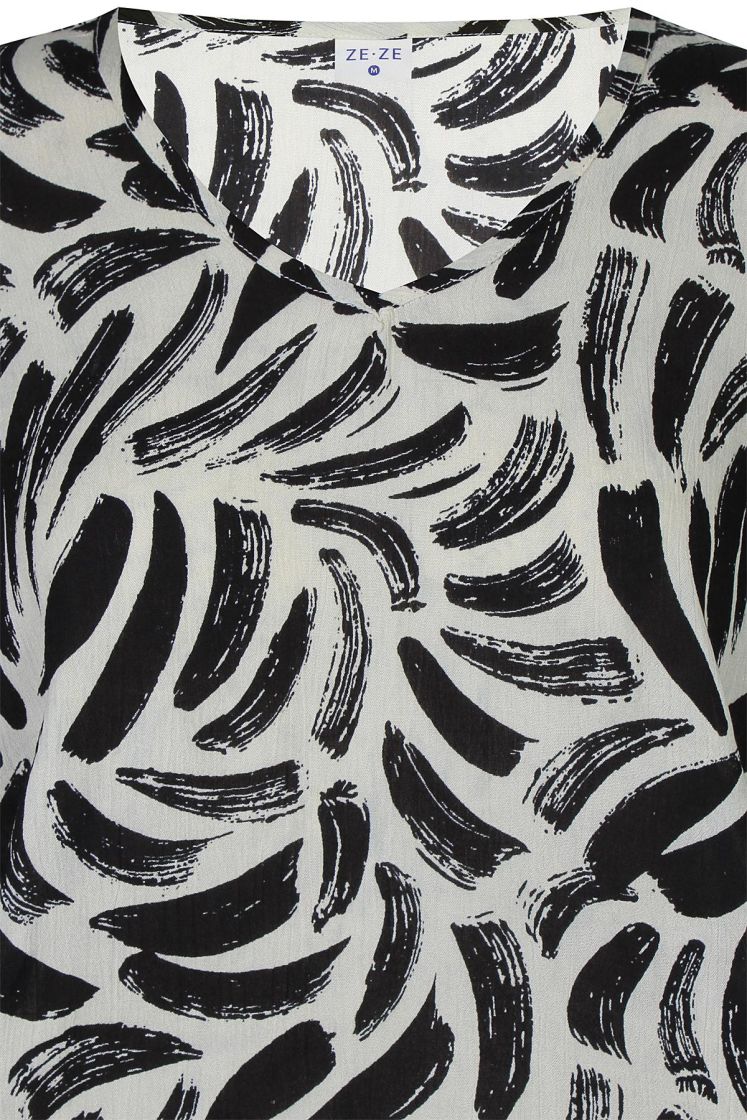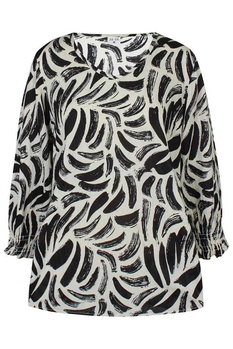 Ze-Ze pusero mukavan ohutta ja pehmeää kreppiviskoosia. pääntie on kivan avoin ja takana ryhtiä tuo kaarroke. Vajaamittainen hiha joustonauhalla tuo kivan kevyen ilmeen. Suora ja väljä malli.