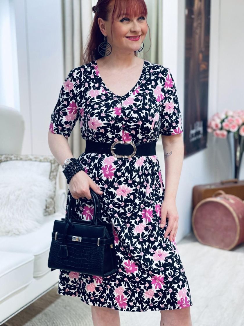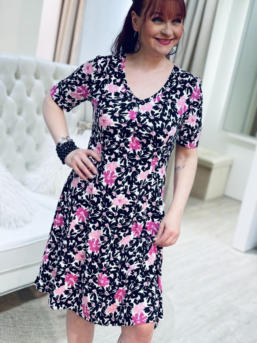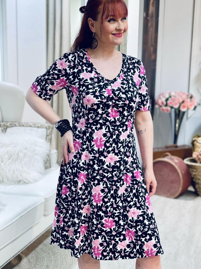 Kaksi kuosin värivaihtoehtoa, pehmeä ruskea ja pirteä pinkki! ZE-ZE kaunis sekä linjakas kellohelmainen mekko ohutta ja pehmeää viskoositrikoota. V-pääntien alla ilmettä antaa joustorypytys ja hihansuussa halkion söpö yksityiskohta. Materiaali on todella joustavaa ja miellyttävää päällä.