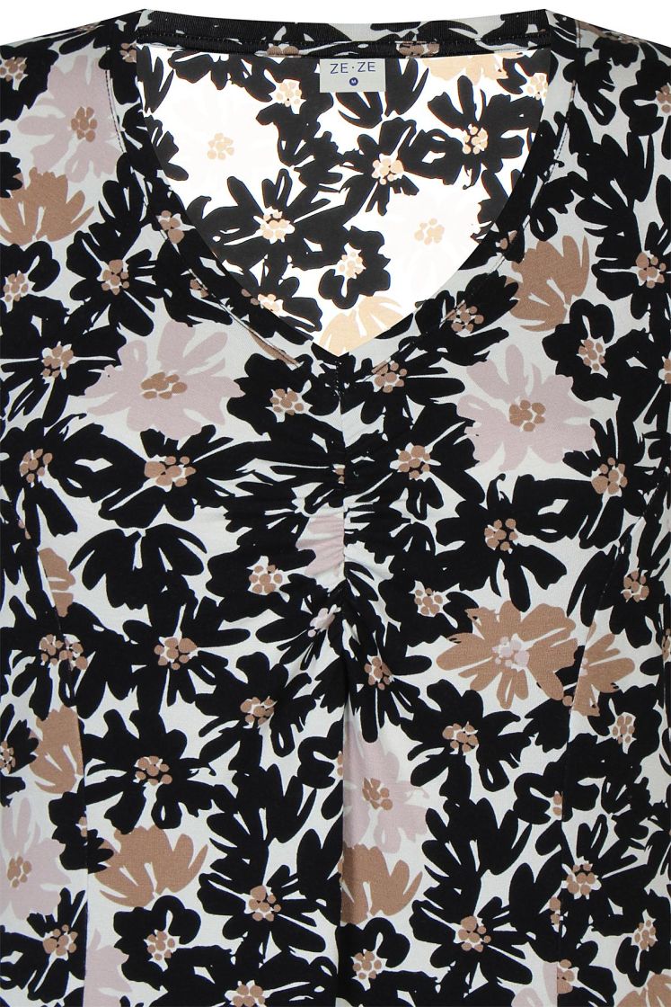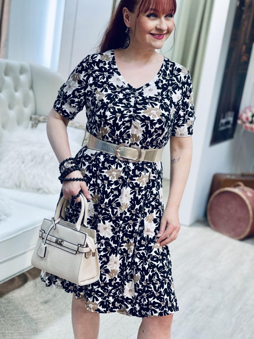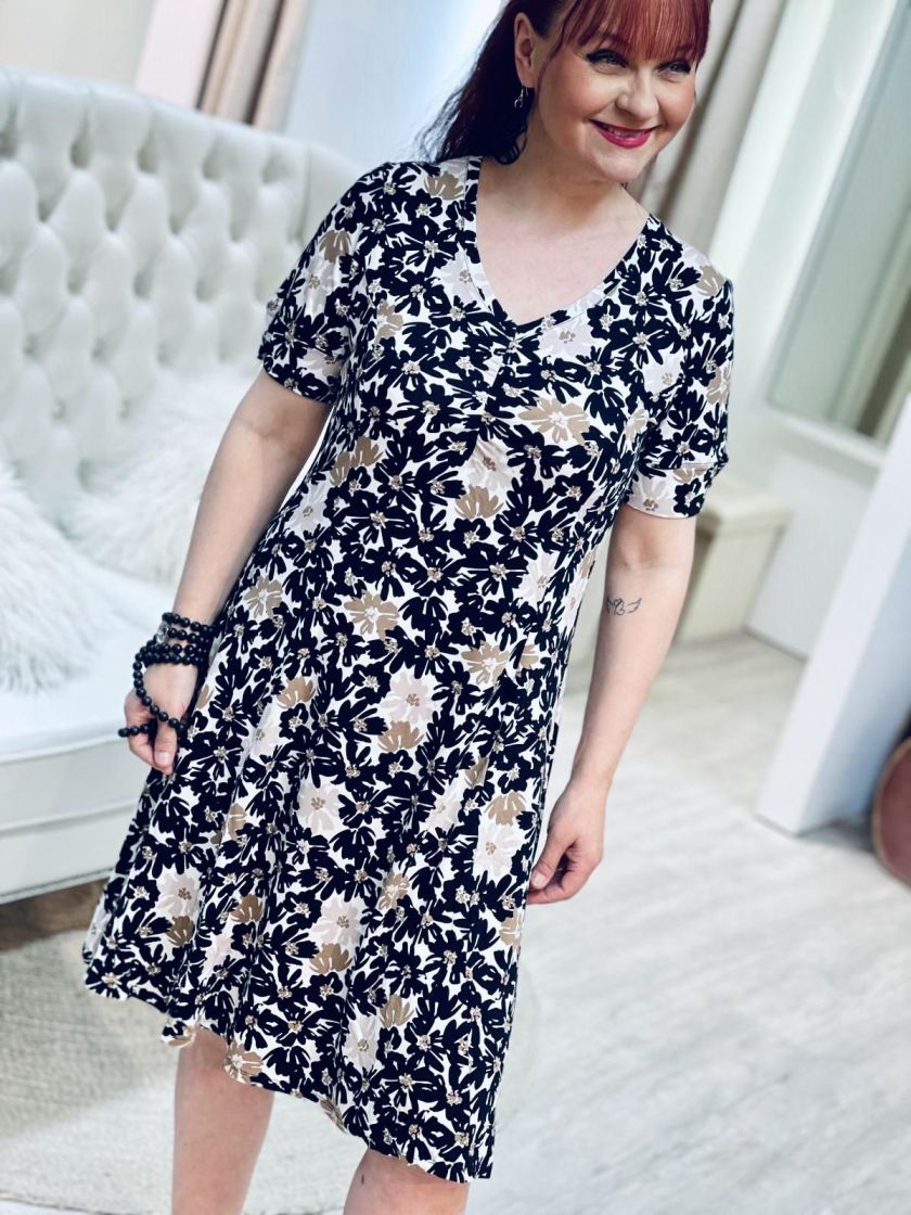 ZE-ZE kaunis sekä linjakas kellohelmainen mekko ohutta ja pehmeää viskoositrikoota. V-pääntien alla ilmettä antaa joustorypytys ja hihansuussa halkion söpö yksityiskohta. Materiaali on todella joustavaa ja miellyttävää päällä.