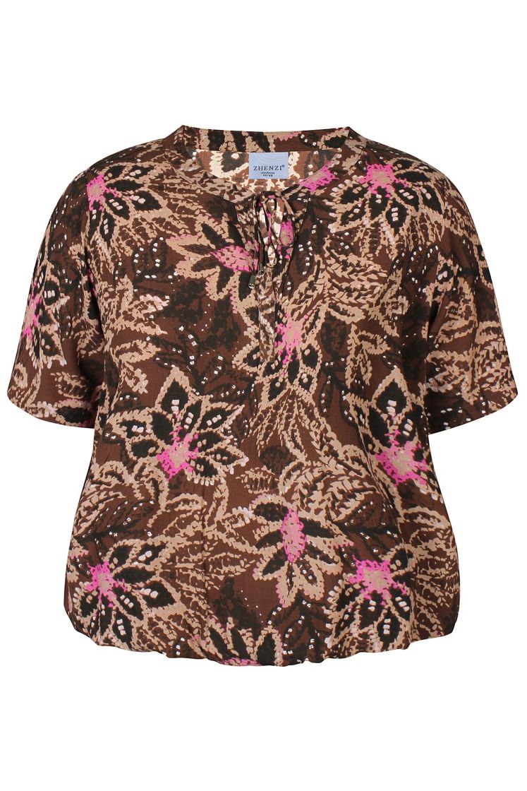 Kaunis suklaanruskea kuosi ripauksella pinkkiä! Plusmerkiltä Zhenzi pusero miellyttävää kreppiviskoosia. Mallissa on kivan avoin pääntie solmittavilla nauhoilla ja helman pitää kauniisti ryhdissä joustoresori. Malli on väljä, tarkistathan mitat.