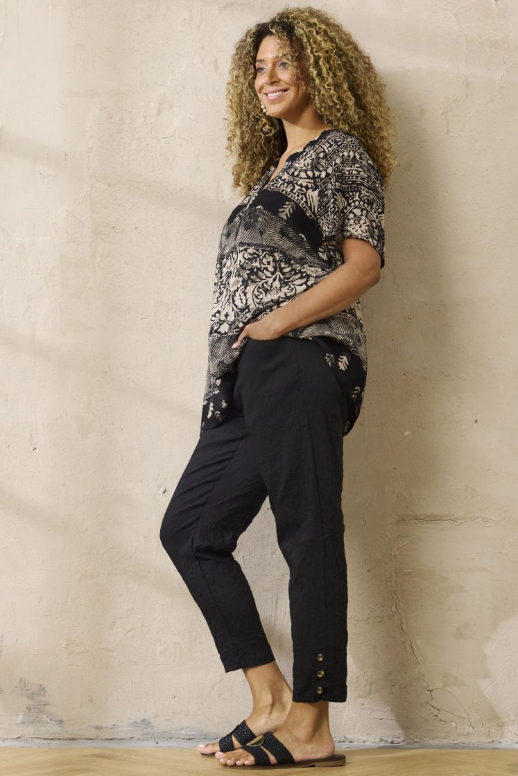 Plusmerkiltä Zhenzi pusero mukavaa kreppiviskoosia. Pääntiellä ilmettä antaa kapea frilla, pääntie alla napitus ja takana kaarroke. Hiha on kevyesti vajaamittainen. Tarkistathan mitat.