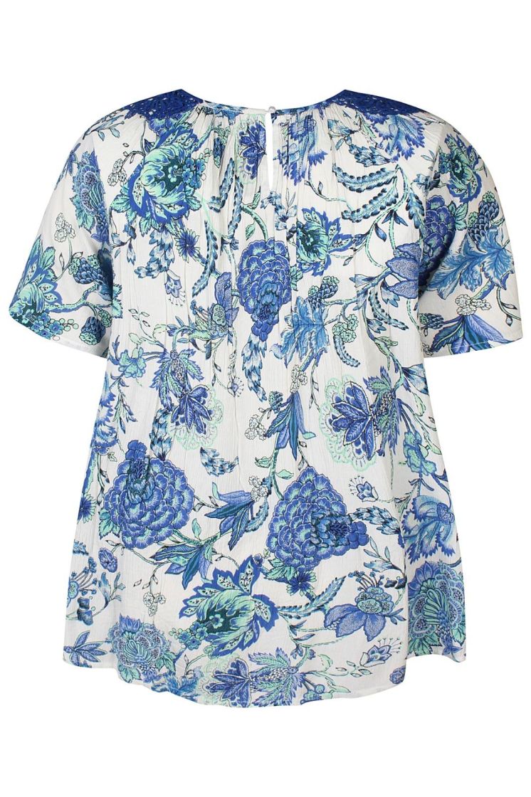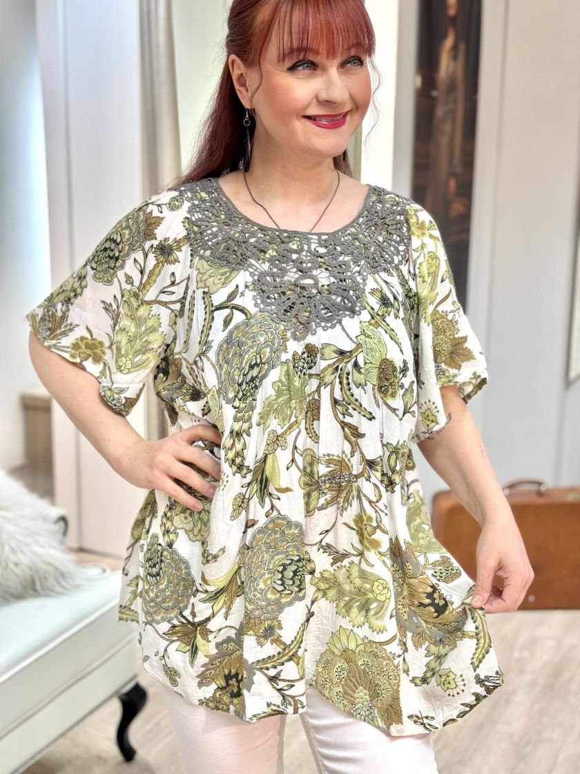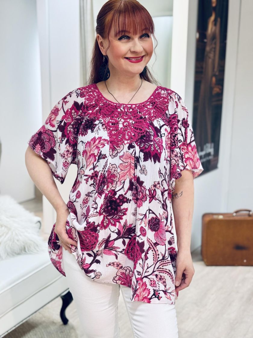 Todella huoleton materiaali ja kaunis kuosi! Plusmerkiltä Zhenzi tunikapusero mukavan ohutta kreppiviskoosia. Pääntiellä ilmettä antaa näyttävä pitsi. Pieni leveä hiha ja malli kauniisti levenee helmaa kohden. Helmi nappi takana. Tarkistathan mitat.