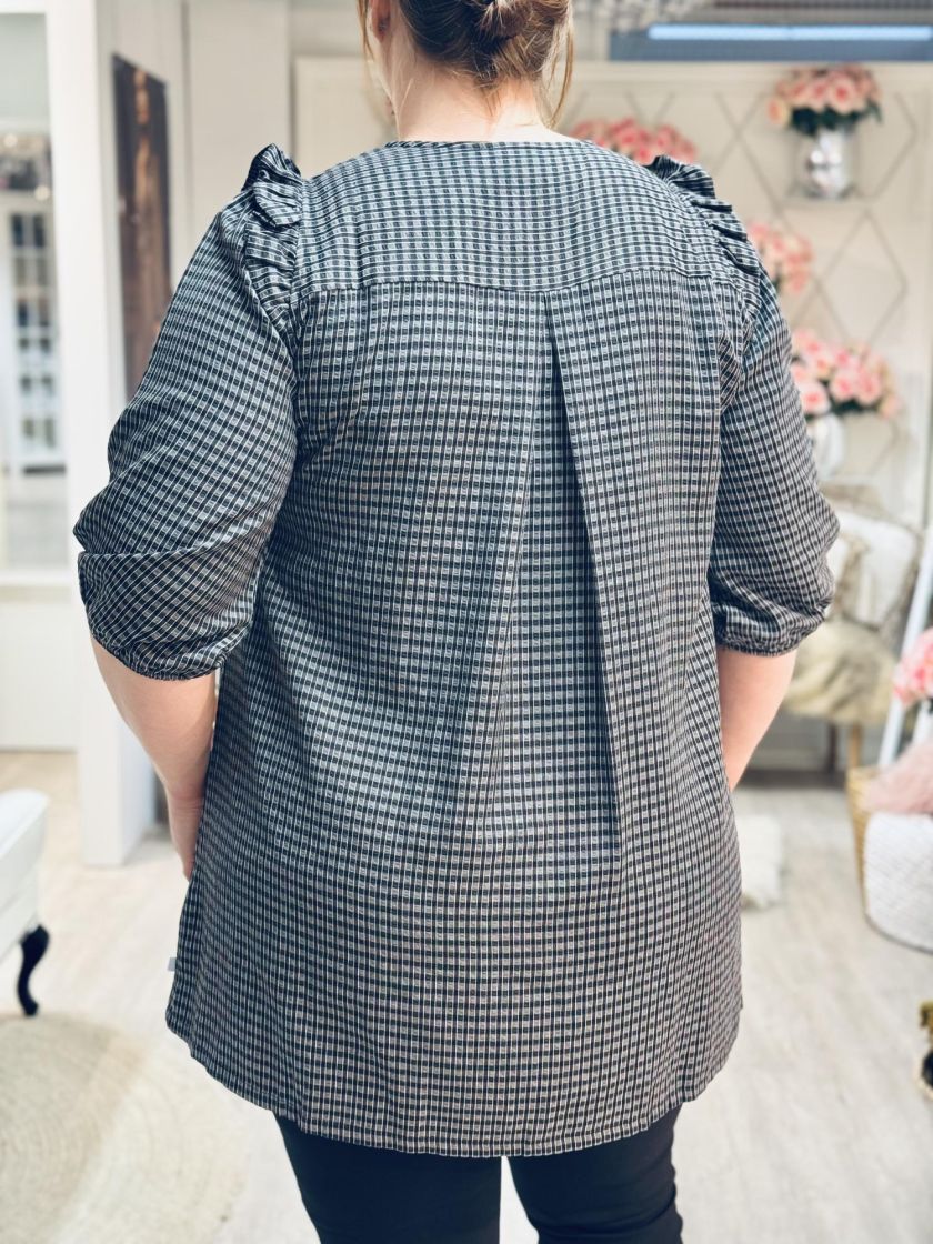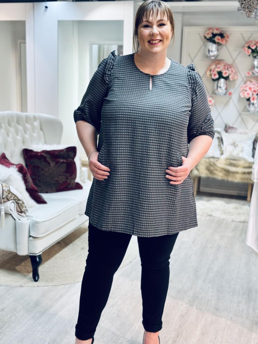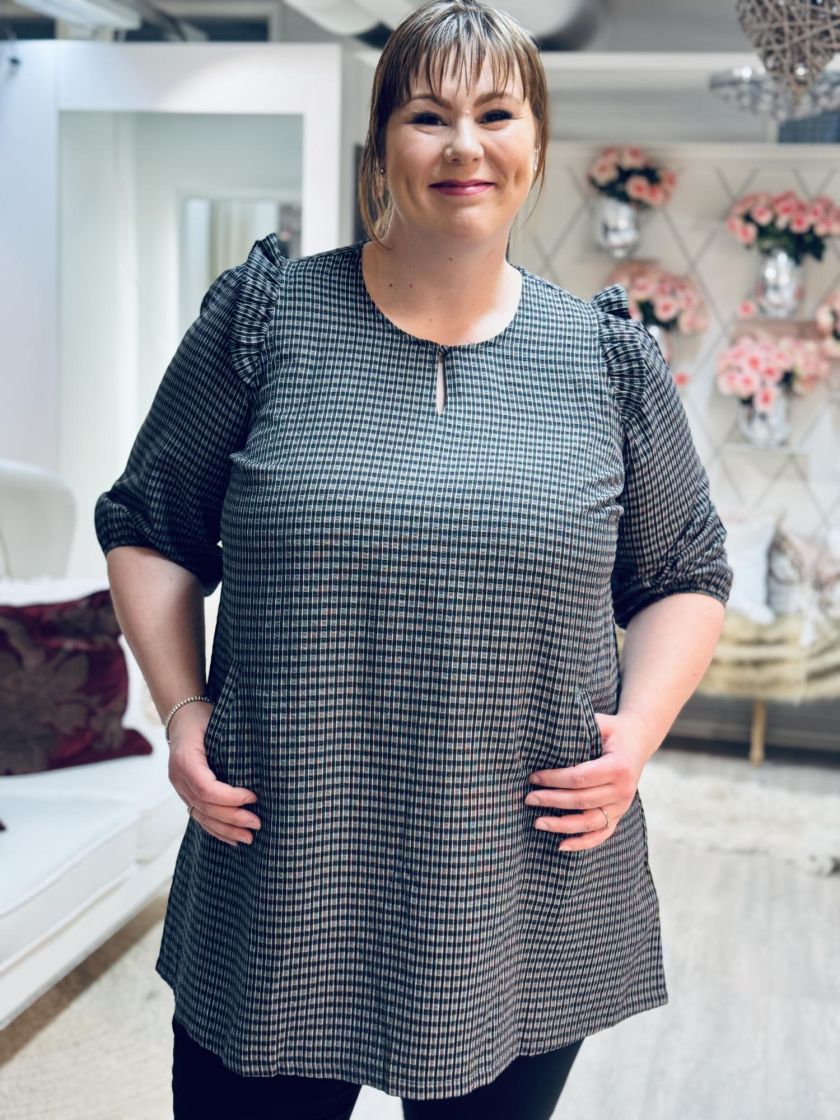 Plusmerkiltä Zhenzi makea ruudullinen tunika/mekko. Tunikassa on väljä hiha, jossa olalla ilmettä tuo kiva frilla ja hihansuussa ryhtiä kuminauha. Edestä löytyy taskut, takaa kaarroke laskoksella ja edestä pääntieltä nappi. Materiaali on kivan ohutta ja malli kauniisti laskeutuva ja a-linjainen.