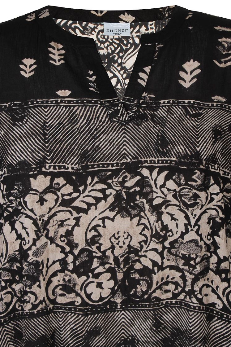 Todella huoleton materiaali ja kiva kuosi! Plusmerkiltä Zhenzi tunika mukavaa ja ilmavan kevyttä kreppiviskoosia. Ilmeikäs pääntie, kaarroke takana ja kaarrettu helma tuo kivaa ilmettä tunikaan. Hiha on kevyesti vajaamittainen ja sitä voi nostaa napin avulla. Taskut sivuilla ja suora väljä malli lisää rentoutta. Mitoitus on reilu, joten tarkistathan mitat.